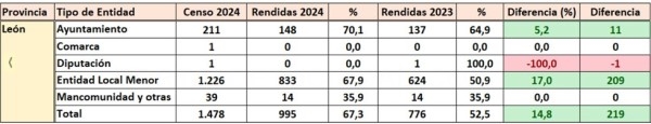 La rendición de las cuentas del ejercicio 2024 en plazo legal por parte de los ayuntamientos de la provincia de León, que finalizó el pasado 31 de octubre, registró un avance destacado con respecto al año pasado con las del ejercicio 2023.